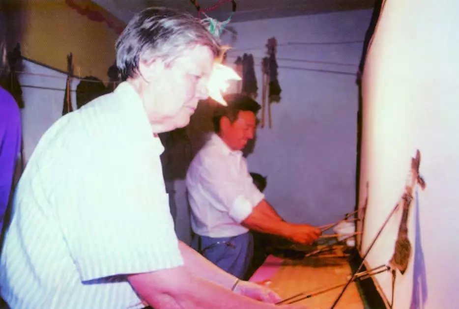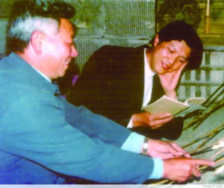 馬王皮影第七代傳人何正同(左)生前傳藝情景