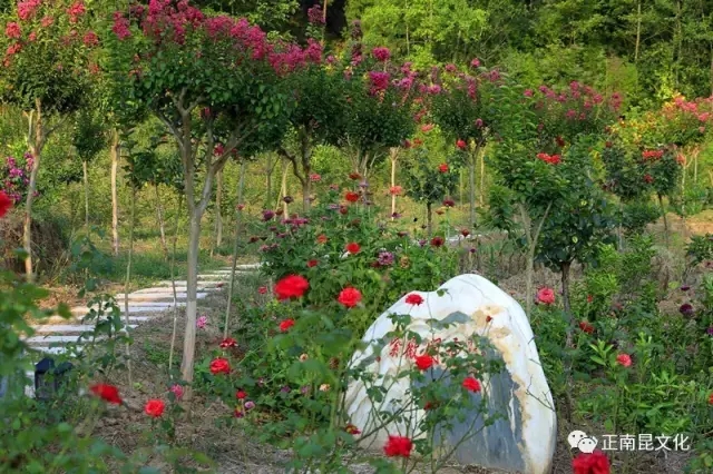 走過(guò)湖泊,劃過(guò)皮艇,經(jīng)過(guò)“百善孝為先”廣場(chǎng),爬上云梯頂,看到站立在忠義廣場(chǎng)的“莊子”;走過(guò)李子林,穿過(guò)桃林, 再到百花園, 滿(mǎn)園的清新空氣,讓人感覺(jué)身體都輕飄飄的。前面就是紫薇花園,主人王新在前面帶路。只見(jiàn)石板路兩邊的紫薇花開(kāi)得正濃,有淡粉的,紅粉的,一簇簇向外伸展,一陣陣香氣撲鼻而來(lái)??吹阶限被ǎ胰杂行┬挠杏嗉虏桓矣|碰,可紫薇花們卻個(gè)個(gè)伸出手臂,輕撫我的臉頰、 頭發(fā)……那柔柔的撫摸和濃濃的香味,讓我忘卻了對(duì)它的芥蒂。