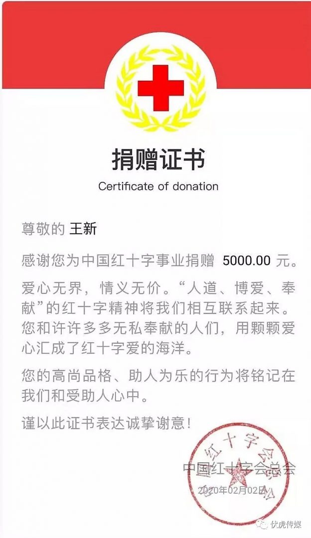 與此同時,王新王總還不忘對外圍疫區(qū)的關(guān)心關(guān)注,并以個人名義分別向中國紅十字會及湖南省慈善總會捐贈了5000元和10000元的現(xiàn)金。