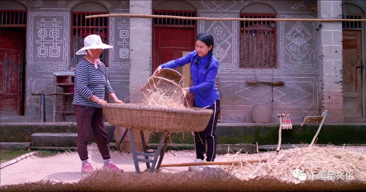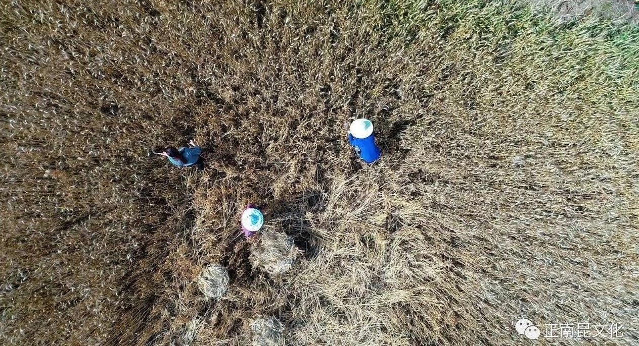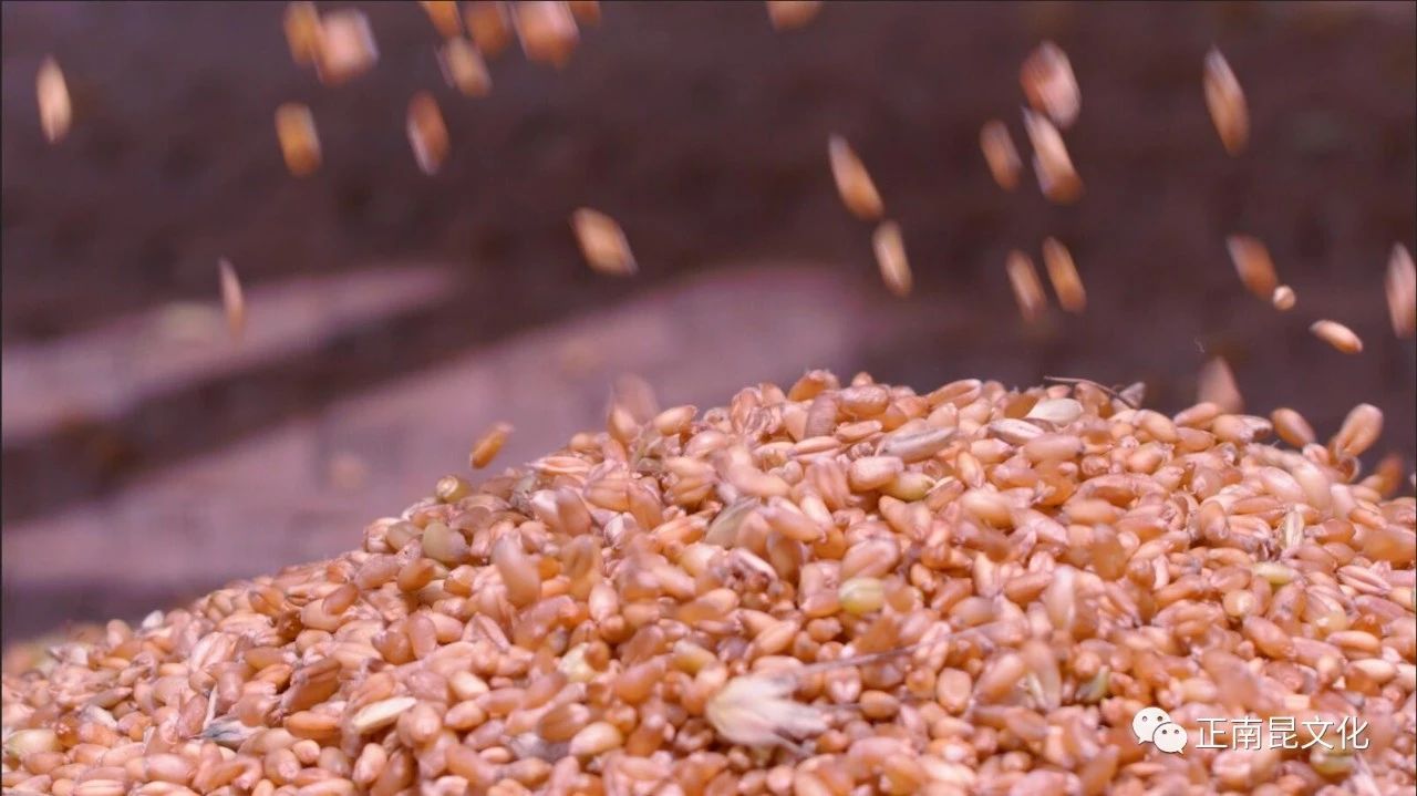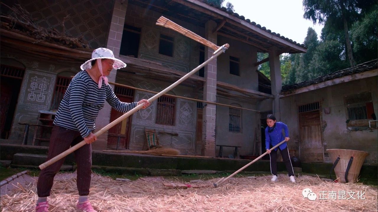 農民們都用連枷打麥子。把麥子鋪石板院壩的曬席上,然后舉起連枷輪番拍打這些麥把子,打完一面,翻過來再打另一面,直到把所有麥粒都打下了,才用木叉將麥草挑到一邊,用漏篩將麥草與麥粒分離開,再撮到另處暴曬。打麥子都要選太陽最毒辣的正午,這時麥子才脆,打起輕松。有時麥把子捂得久了,長了霉,連枷一打下去,刺鼻的霉灰嗆得人直憋氣。將打好的麥粒在房前屋后的平地上進行晾曬一周左右進倉,這樣的手工勞作沿襲了上千年。