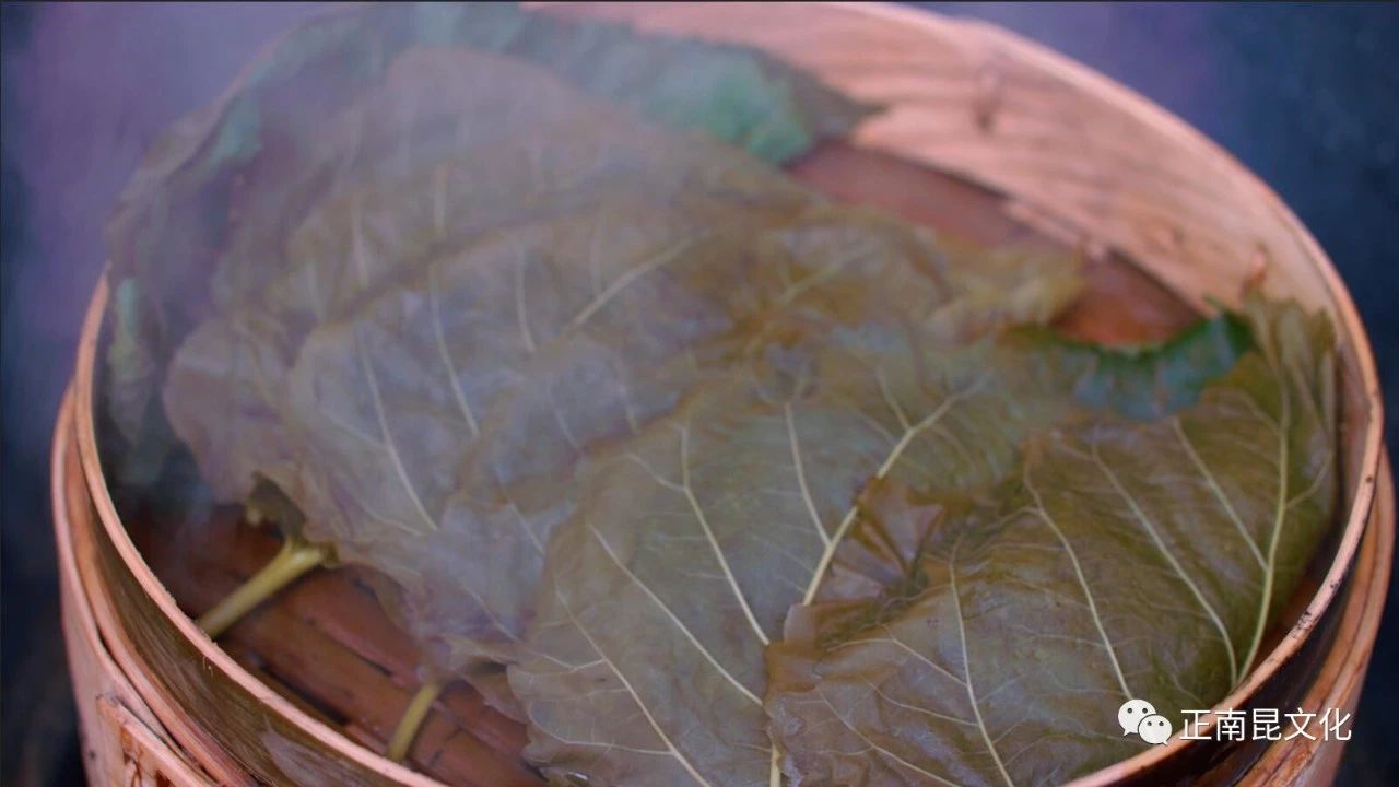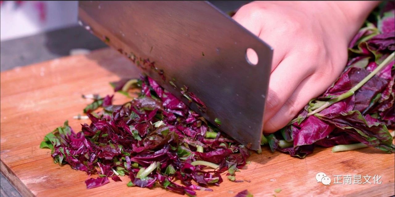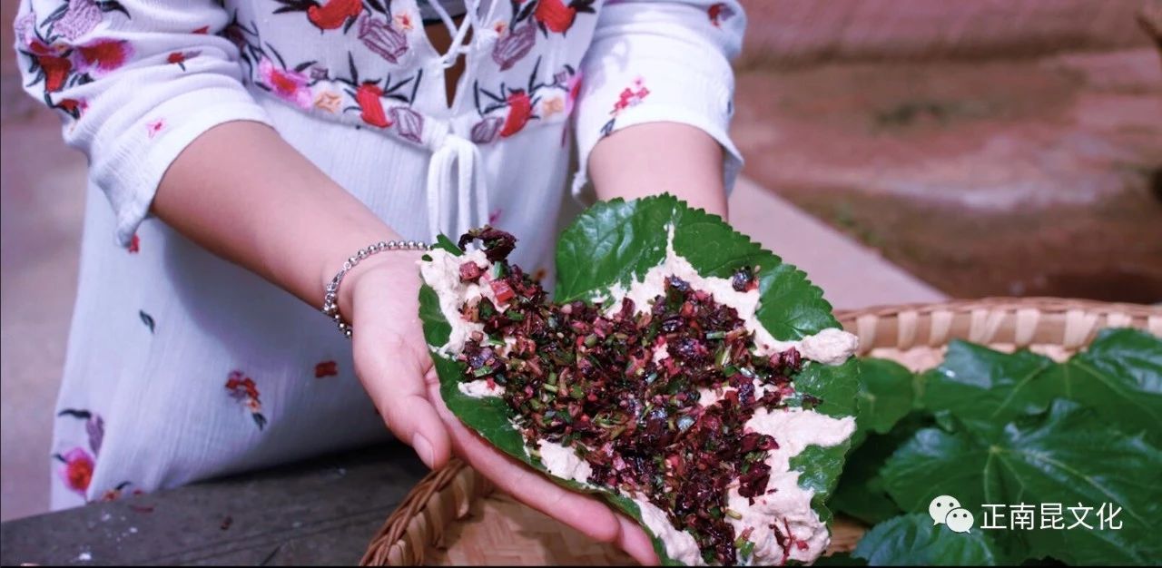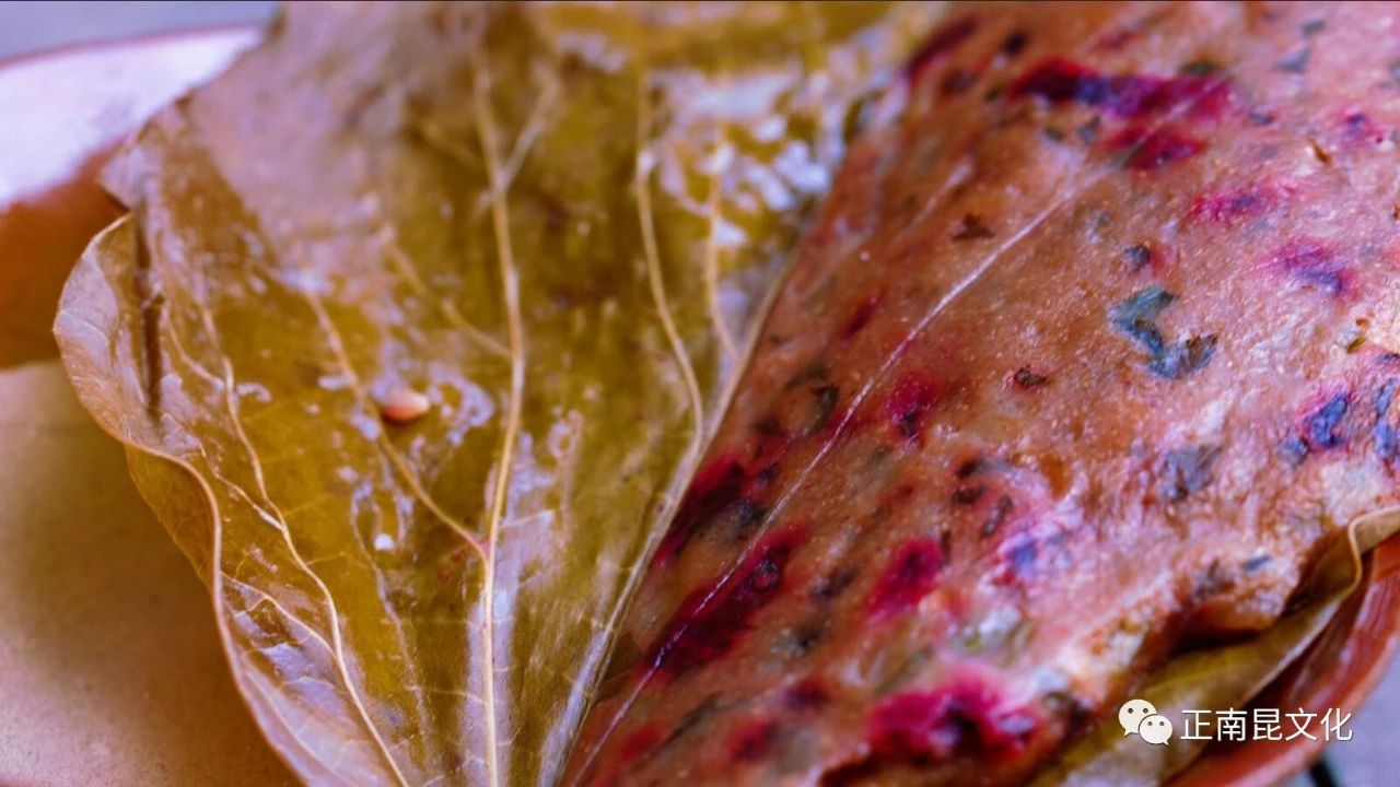 農民用自己新打出的麥子在石磨上磨細,面粉和麥麩連在一起成“連麩面”。再選鮮紅的漢菜砍細成末,加上雞蛋、臘肉和各種調料,用水和“連麩面”攪拌成漿狀,均勻的涂抹在洗干凈的桐籽樹葉或桑葉上,用柴火在鐵鍋上烘煎半熟后,再用竹蒸籠蒸制而成。